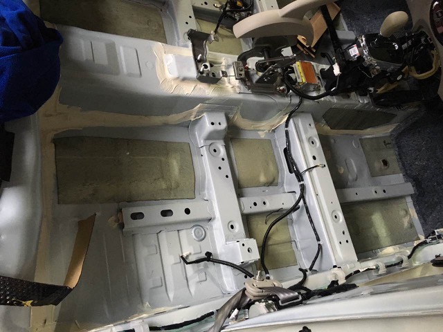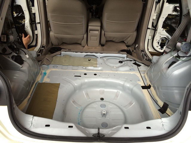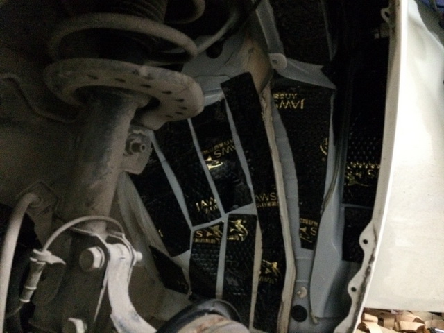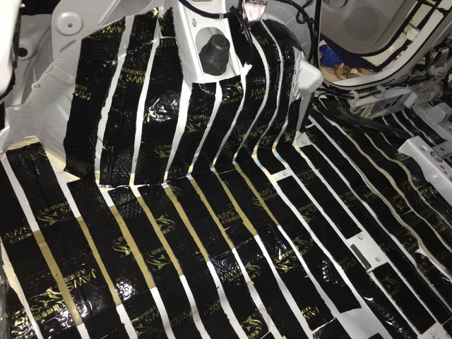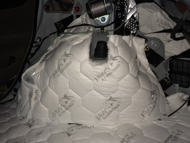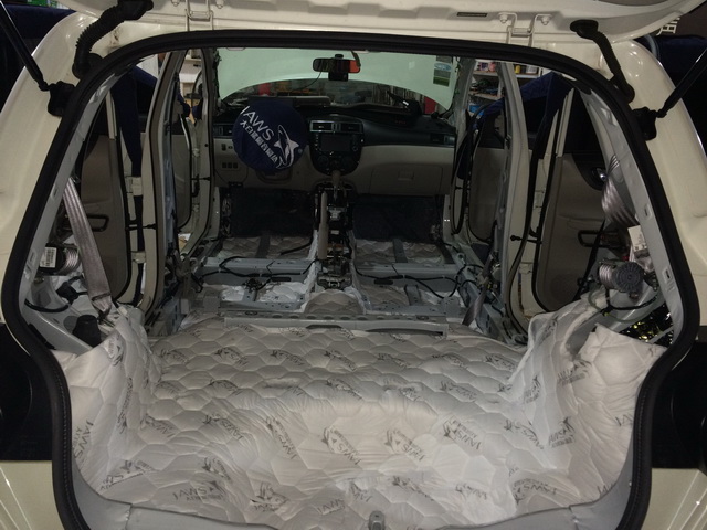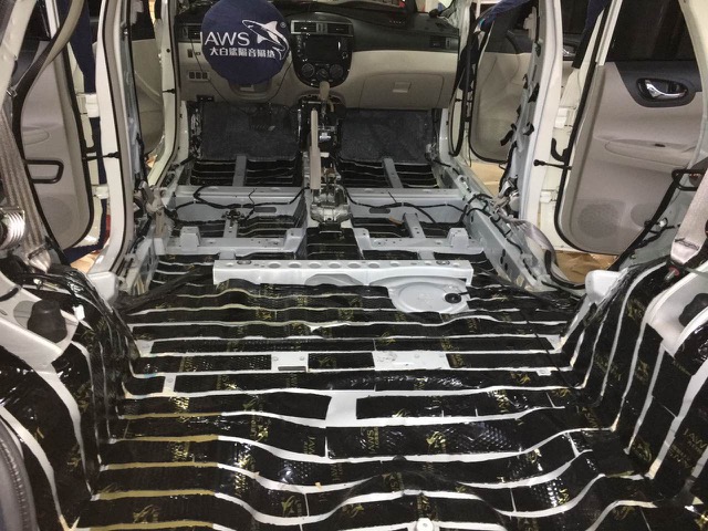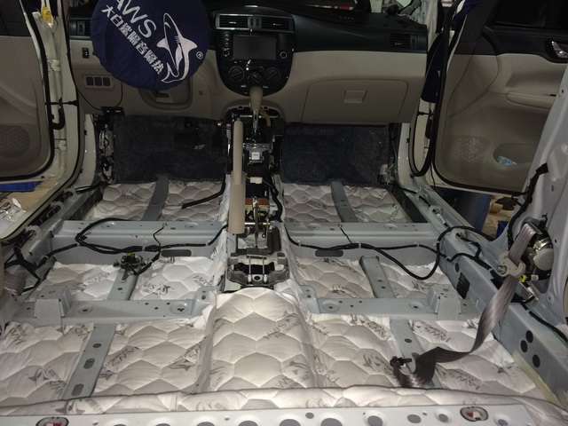 底盘第二层隔音铺上大白鲨吸音棉,对车体进一步密封,达到更好隔音效果