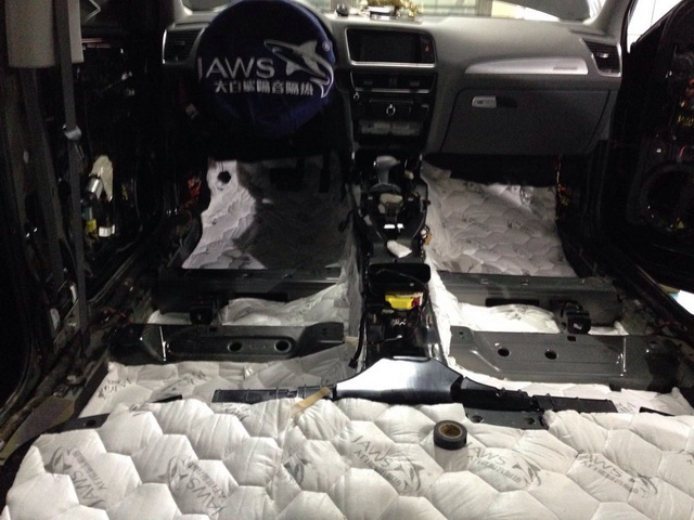 对奥迪Q5的隔音操作,兰州金百盛采用的是大白鲨隔音材料,针对汽车所产生的胎噪,路噪,风噪等杂音情况,对车子的四门、底盘、轮弧、叶子板、尾箱,轮毂,引擎盖,水槽部位做隔音,以达到隔音降噪的目的。