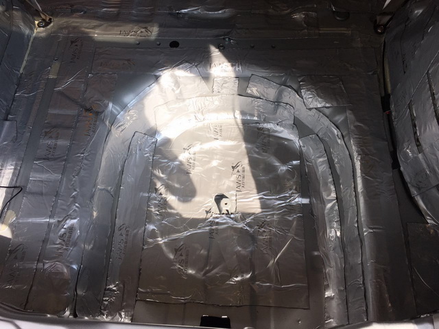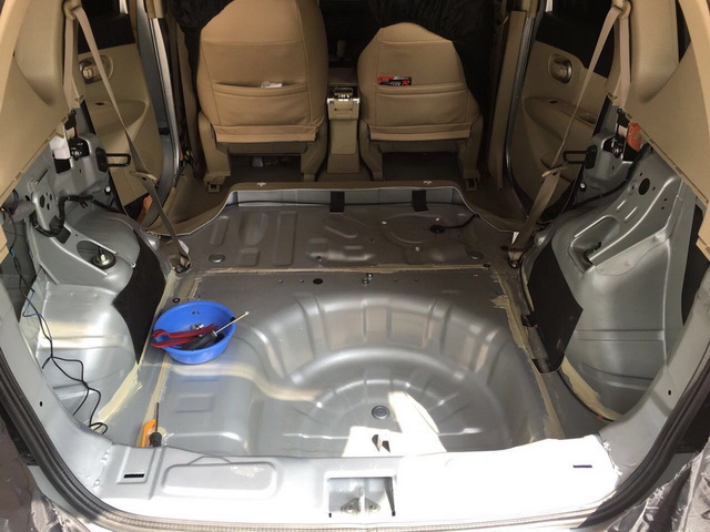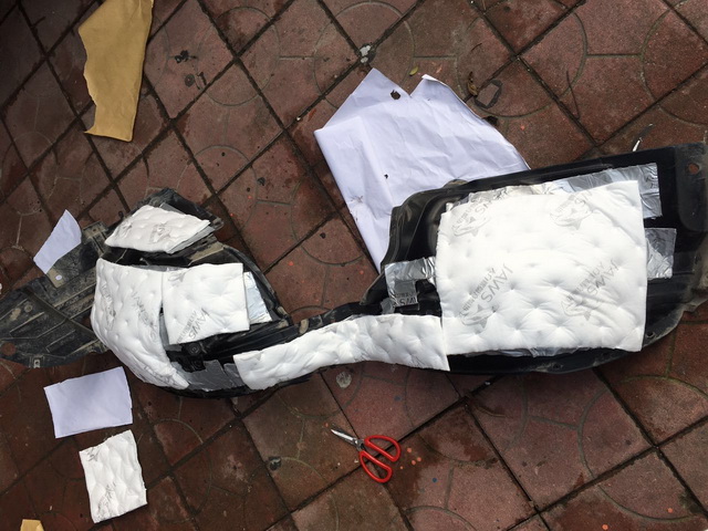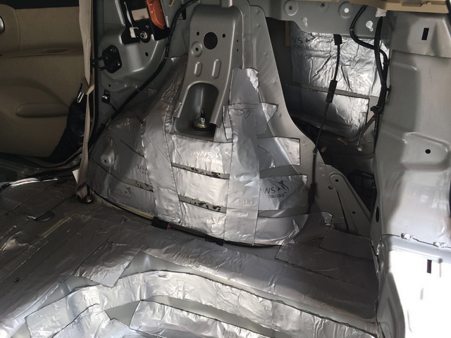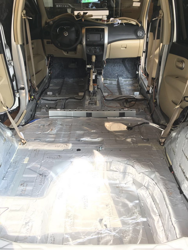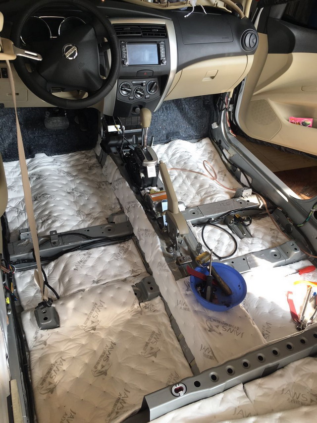 骊威的汽车底盘和尾箱是隔音欠缺的另外一个方面。澄海逸声改装技师使用大白鲨隔音减震胶对汽车底盘做了第一层的止振处理,大白鲨隔音减震胶的主要成分是丁基减震胶,它可以起到减震和隔音的双重作用。在减震的基础上改装技师又使用吸音棉做了进一步的密封处理。
