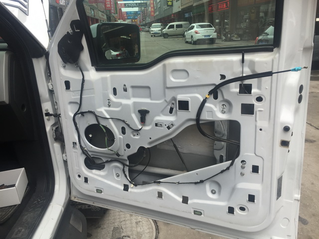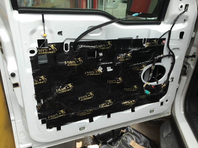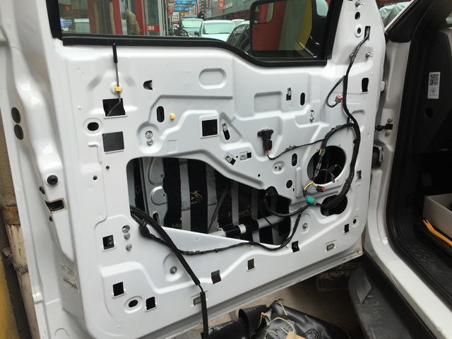 福特猛禽门板厚度比同级别车好很多,但其内部的隔音措施十分欠缺,西安志远的改装技师拆开汽车门板发现门板内部随处可见各种大小不同的空洞,但原车却并未做任何的隔音处理,所以改装技师使用大白鲨金鲨隔音材料对汽车的门板以及门板饰盖做了认真而全面的隔音处理。