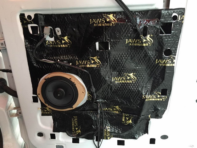 汽车门板的隔音除了能够降低车厢内的噪声之外,它同时还有提升声场喇叭的作用,西安志远的改装技师对细节的处理也非常到位,改装技师还特别为汽车的声场喇叭增加了木质垫圈,从而使得汽车的声音效果能够更加的出色动听一些。