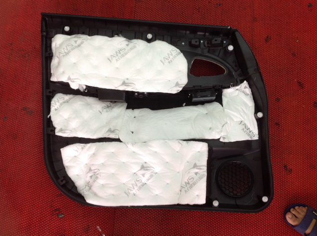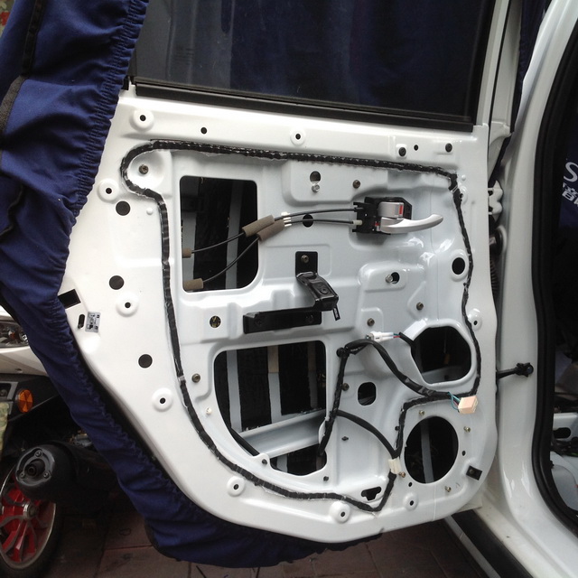 隔音先从汽车的门板开始,拆开长安CX20的汽车门板可以看到内部所使用的隔音材料只有一层劣质的薄膜,这样的隔音效果可想而知,汕头猫王的改装技师将原车隔音材料清除,然后使用大白鲨隔音材料对汽车门板做了内外双层的隔音处理,为了保证隔音的效果就连门板饰盖也做了隔音处理。