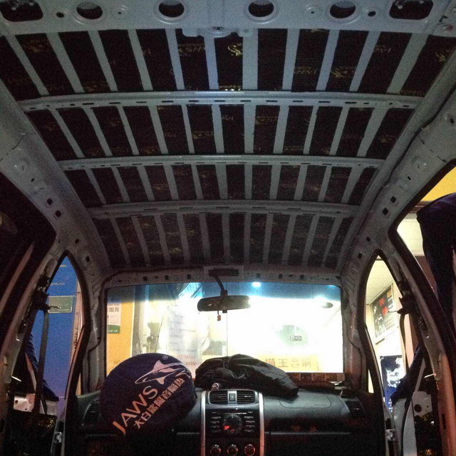 汽车除了要注重隔音效果之外,车厢内温度的恒定也同样重要,长安CX20的原车顶棚只是一层单薄的铁皮结构,在遇到下雨天等恶劣天气的时候车厢内噪声不仅会增加,同时还对车厢内的温度有着很大的影响,因此汕头猫王的改装技师使用隔音材料对汽车的顶棚也做了隔音密封处理。