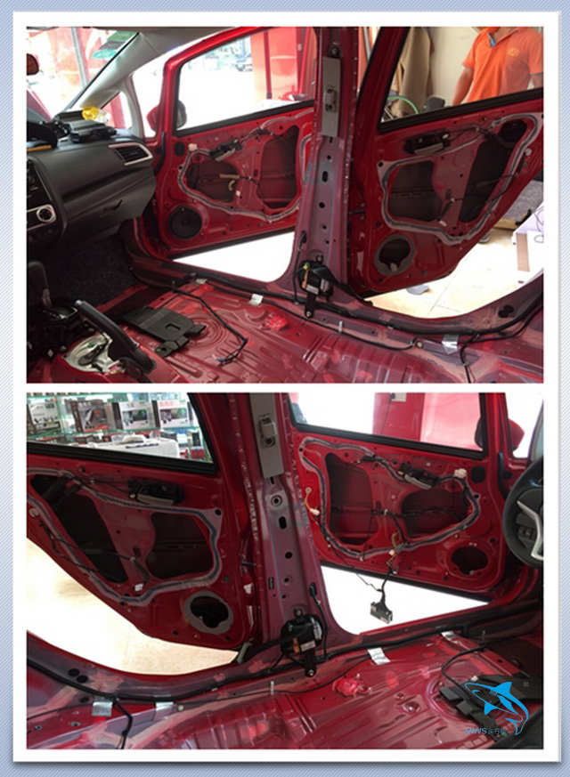 本田飞度的原车门板铁皮结构单薄,风噪很容易通过门板传入到车厢的内部,因此佛山盛隆的改装技师,使用大白鲨隔音材料,对汽车的门板和饰盖做了全面的隔音处理,从而降低了风噪的传入。