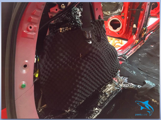 底盘和尾箱是低频共振的重灾区,但原车的底盘和尾箱并未做有效的隔音处理,因此佛山盛隆的改装技师,先使用大白鲨隔音减震胶对汽车的底盘做了第一层的止振处理,然后又使用大白鲨隔音棉和大白鲨白棉做了密封处理,三层的隔音处理也将底盘和尾箱的共振噪声降低到了最小。为了阻止胎噪的传入,改装技师还对汽车的轮毂也做了认真的隔音处理。