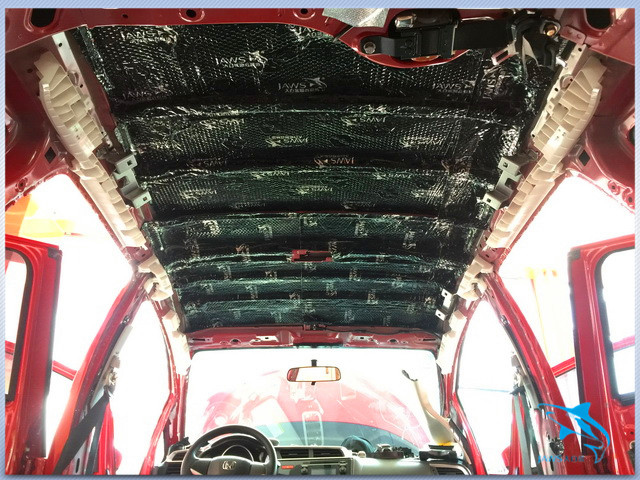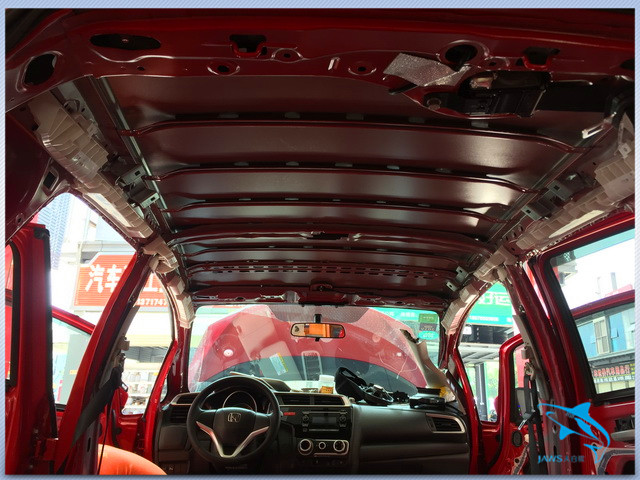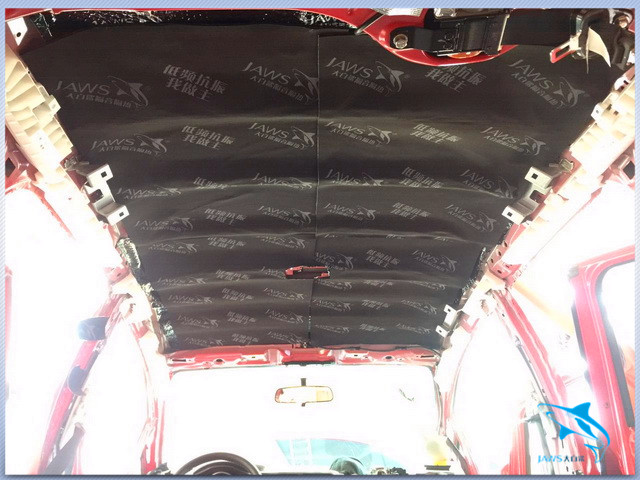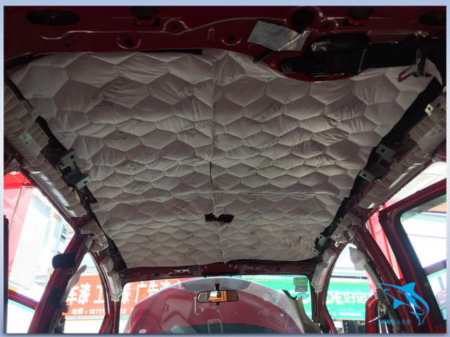原车的顶棚只是一层单薄的铁皮结构,这既不利于车厢内温度的恒定,同时在阴雨天的时候,顶棚也很容易产生较大的噪声,因此佛山盛隆的改装技师,使用大白鲨隔音材料,对汽车的顶棚也做了三层的隔音处理,从而起到了降低噪声、维持车厢内温度恒定的作用。