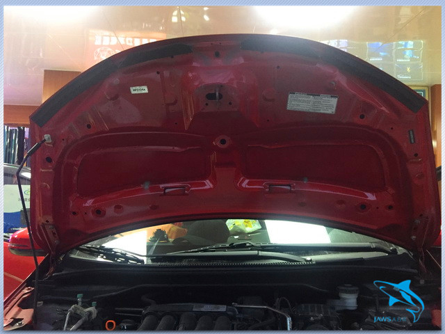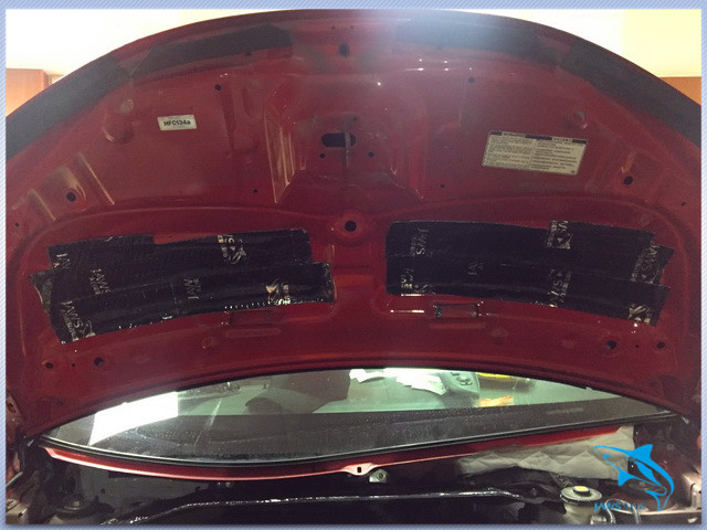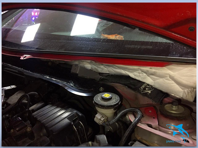 汽车在高速行驶的时候,发动机舱内产生的大量噪声也会传入到车厢的内部,因此佛山盛隆的改装技师,一方面使用大白鲨隔音材料,对汽车的引擎盖做了隔音处理,另外一方面又对汽车的U型槽做了密封处理,从而降低了发动机舱内噪声的产生和传入。