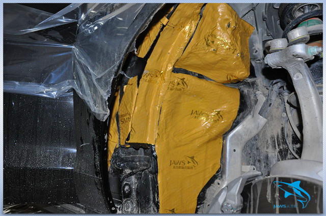 汽车的胎噪和路噪主要是通过轮弧等部位传入到车厢的内部,但原车的轮弧并未做有效的隔音处理,因此贵阳元音改的改装技师,使用大白鲨金鲨隔音材料,对汽车的轮弧做了认真的隔音处理,从而切断了胎噪的传播途径。
