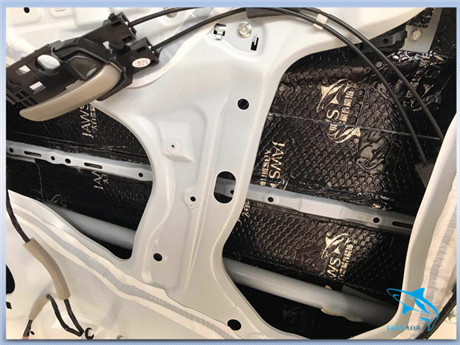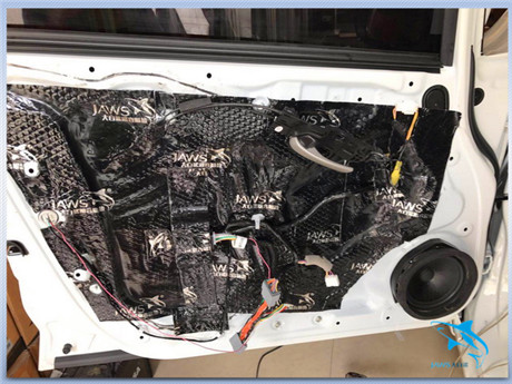 汽车在行驶时候产生的风噪主要是通过门板等部位传入到车厢内部的,因此河源宝声汽车音响的改装技师,使用大白鲨隔音材料对汽车的门板做了双层的隔音处理,从而有效的阻止了风噪的传入。