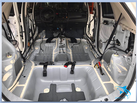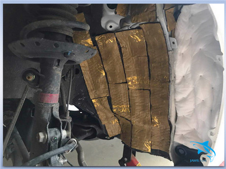 使用大白鲨隔音材料对汽车底盘做第一层隔音处理,有效起到止振的作用
