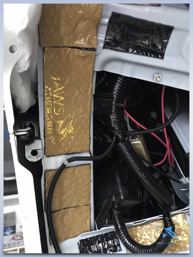 汽车在行驶的时候,轮胎与地面摩擦会产生大量的胎噪,而此类的噪声主要是通过轮弧等部位传入到车厢的内部,因此河源宝声汽车音响的改装技师,使用大白鲨金鲨以及大白鲨吸音棉对汽车的轮弧做了隔音处理,从而切断了胎噪的传播途径。