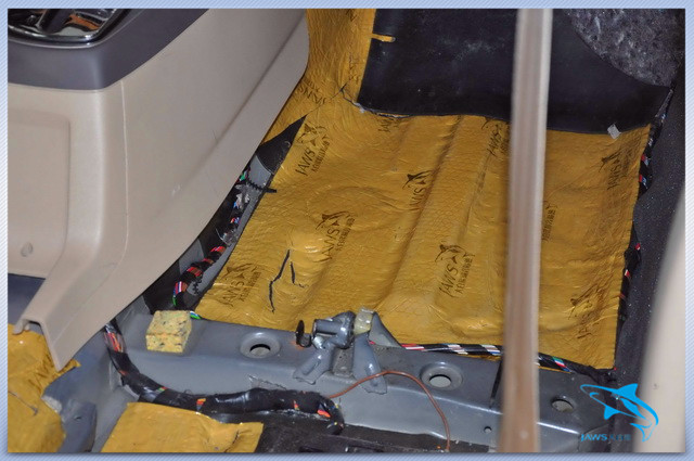 底盘和尾箱是低频共振的重灾区,但原车的底盘和尾箱隔音措施也非常的欠缺,因此贵阳元音改的改装技师,先使用大白鲨黄金甲,对汽车的底盘和尾箱做了一层的止振处理,减少钣金共振产生的低频噪音。然后又使用大白鲨吸音棉,对汽车的底盘和尾箱做了二层的吸音隔热处理,从而加强了隔音效果。为了阻止胎噪的传入,改装技师还对汽车的轮毂也做了认真的隔音处理。