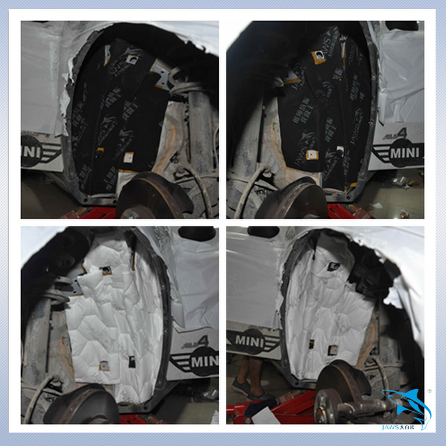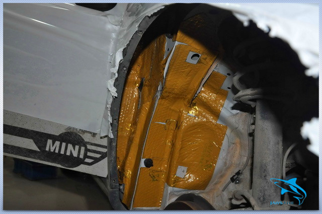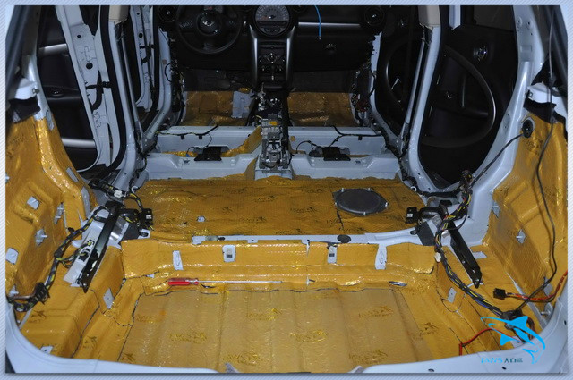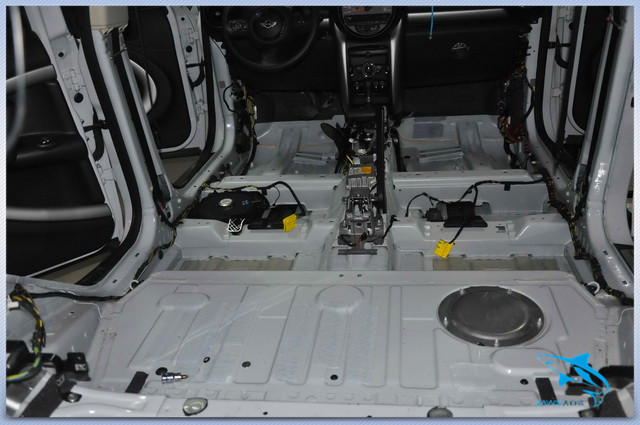 根据客户的诉求,贵阳元音改的改装技师,针对性的定制了宝马MINI全车噪声的解决方案,主要是对汽车的四门、底盘、尾箱和轮弧等部位做了隔音处理。