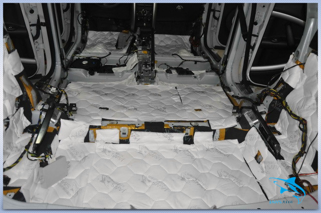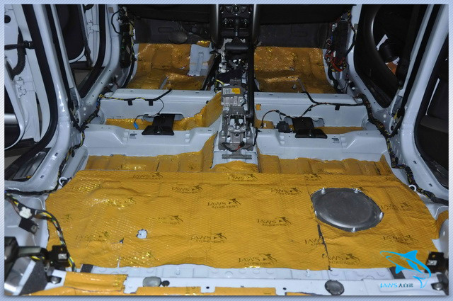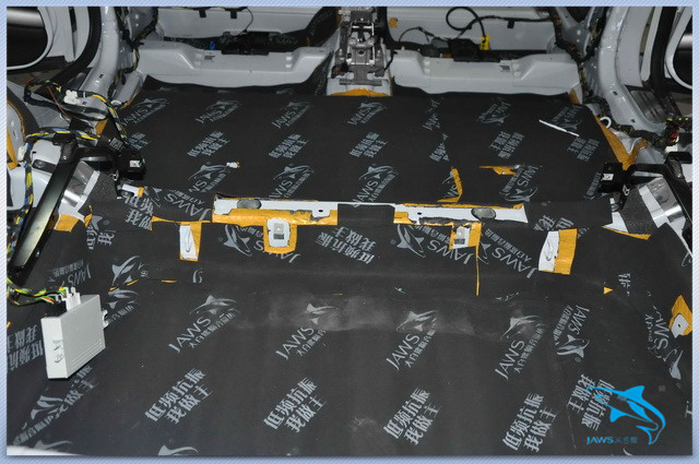 使用大白鲨隔音材料对汽车底盘做第一层隔音处理,有效起到止振的作用