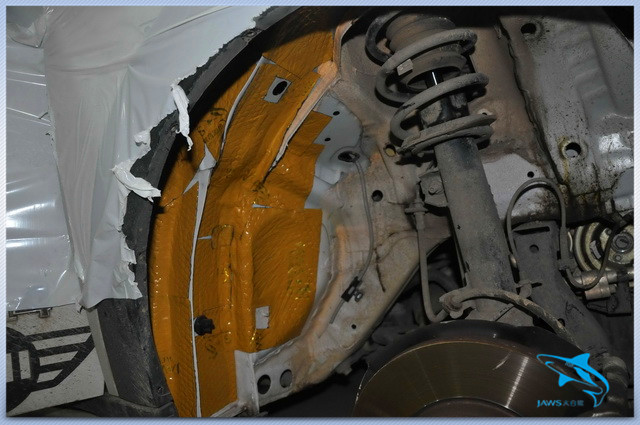 为了减少胎噪的传入,改装技师在车厢内部对汽车的轮毂做了隔音处理,在车厢外部对汽车的轮弧做了隔音处理,这就直接切断了胎噪的传播途径,从而减少了胎噪和路噪的传入。