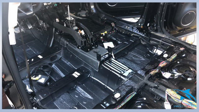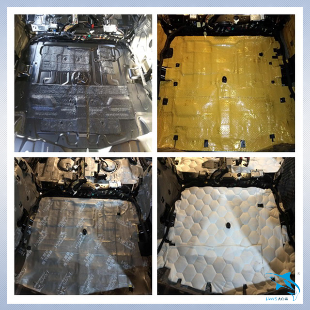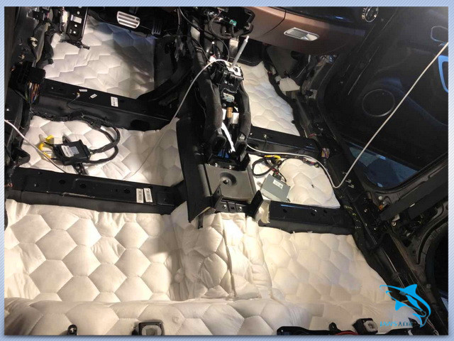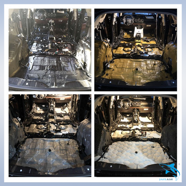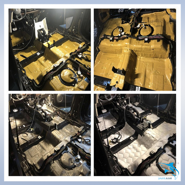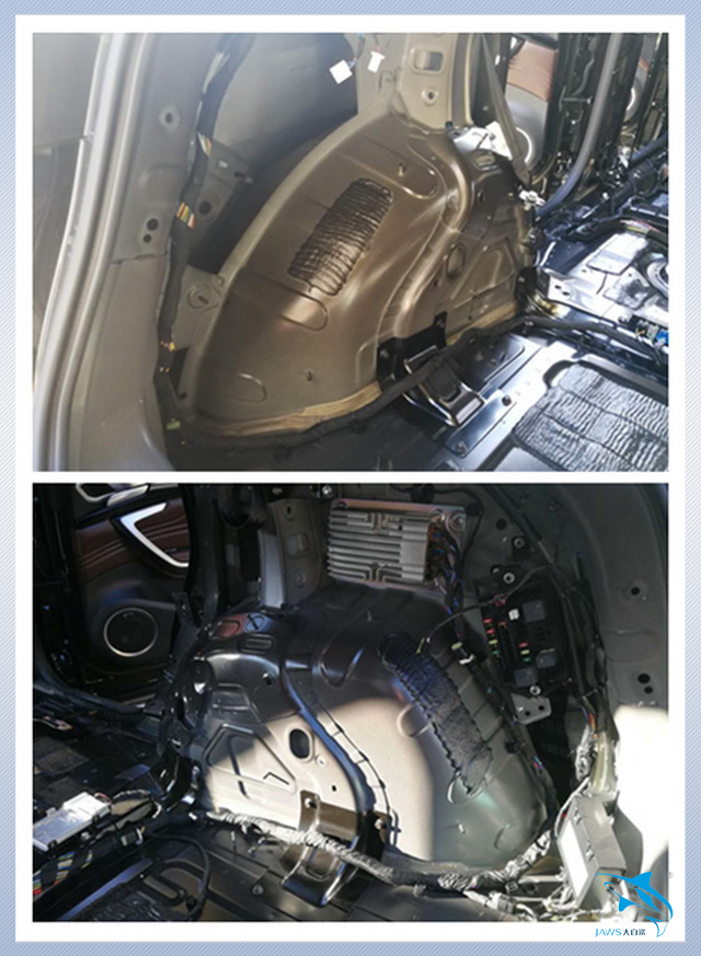 先说说汽车自身的噪声。汽车在行驶的时候会产生较大的低频共振噪声,而主要的产生部位就是汽车的底盘和尾箱。因此汕头车韵的改装技师,先使用大白鲨金鲨对汽车的底盘和尾箱做了第一层的止振处理,它采用高级丁基胶特制而成,复合高韧性铝箔,具有超强的止振效果。然后改装技师又使用大白鲨吸音棉对底盘和尾箱做了第二层的密封处理,使得汽车的止振效果更加明显。